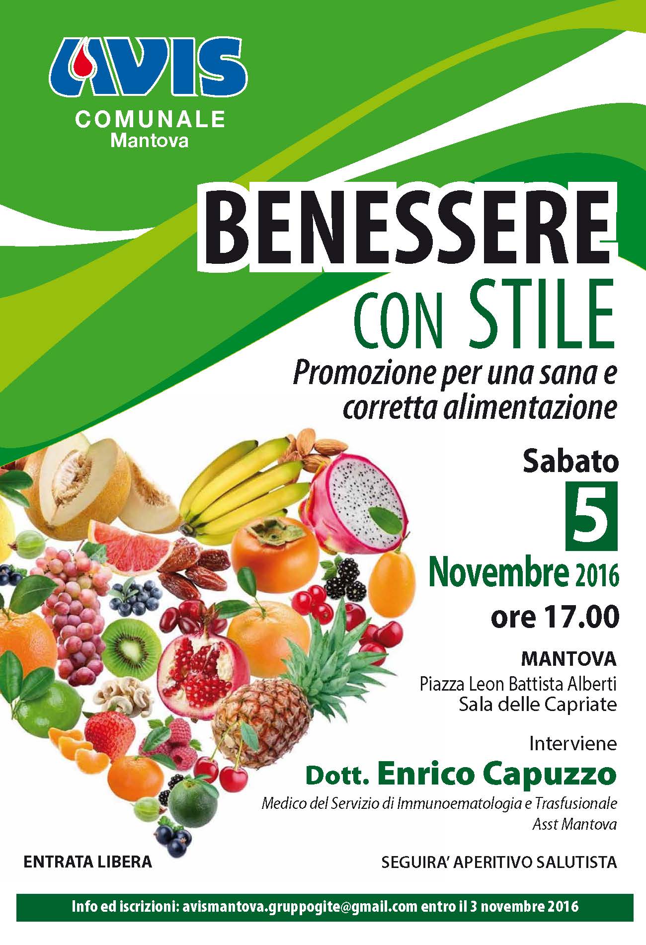 Un folto pubblico ha partecipato sabato 5 novembre presso la Sala delle Capriate in Mantova all’evento organizzato da Avis Comunale Mantova. Il titolo dell’incontro "Benessere con Stile", condotto dal Dott.Capuzzo, medico di immunoematologia trasfusionale, ci ha guidato in un ampio panorama di informazioni sulle diete miracolose e ci ha permesso di capire quali sono gli [...]